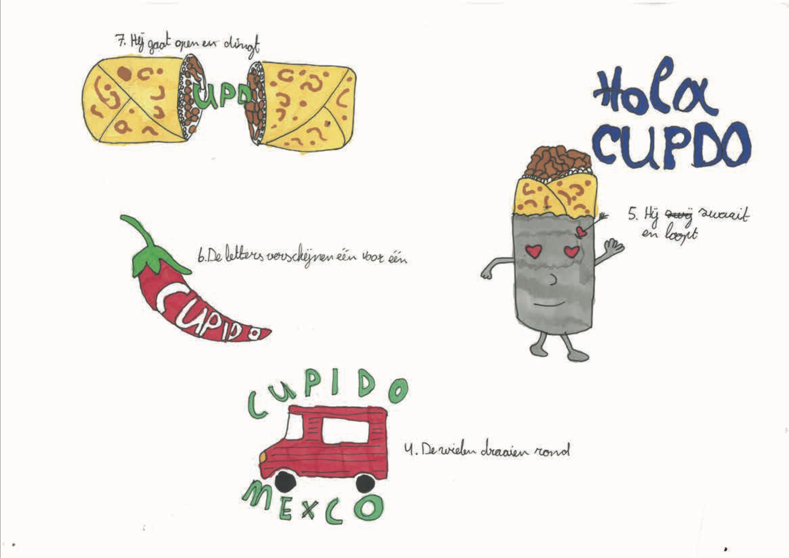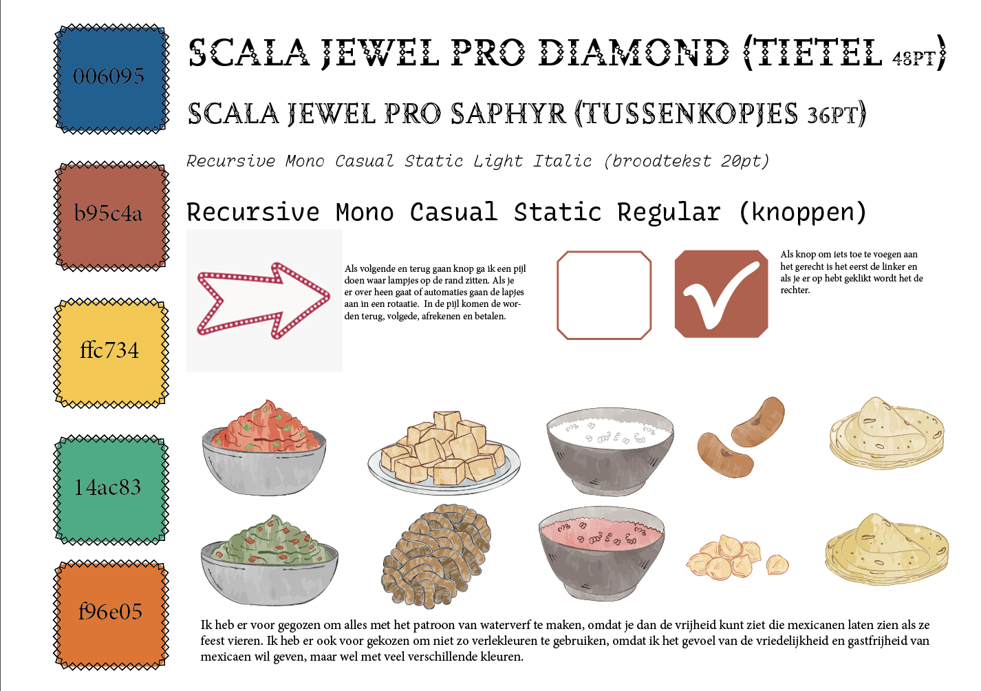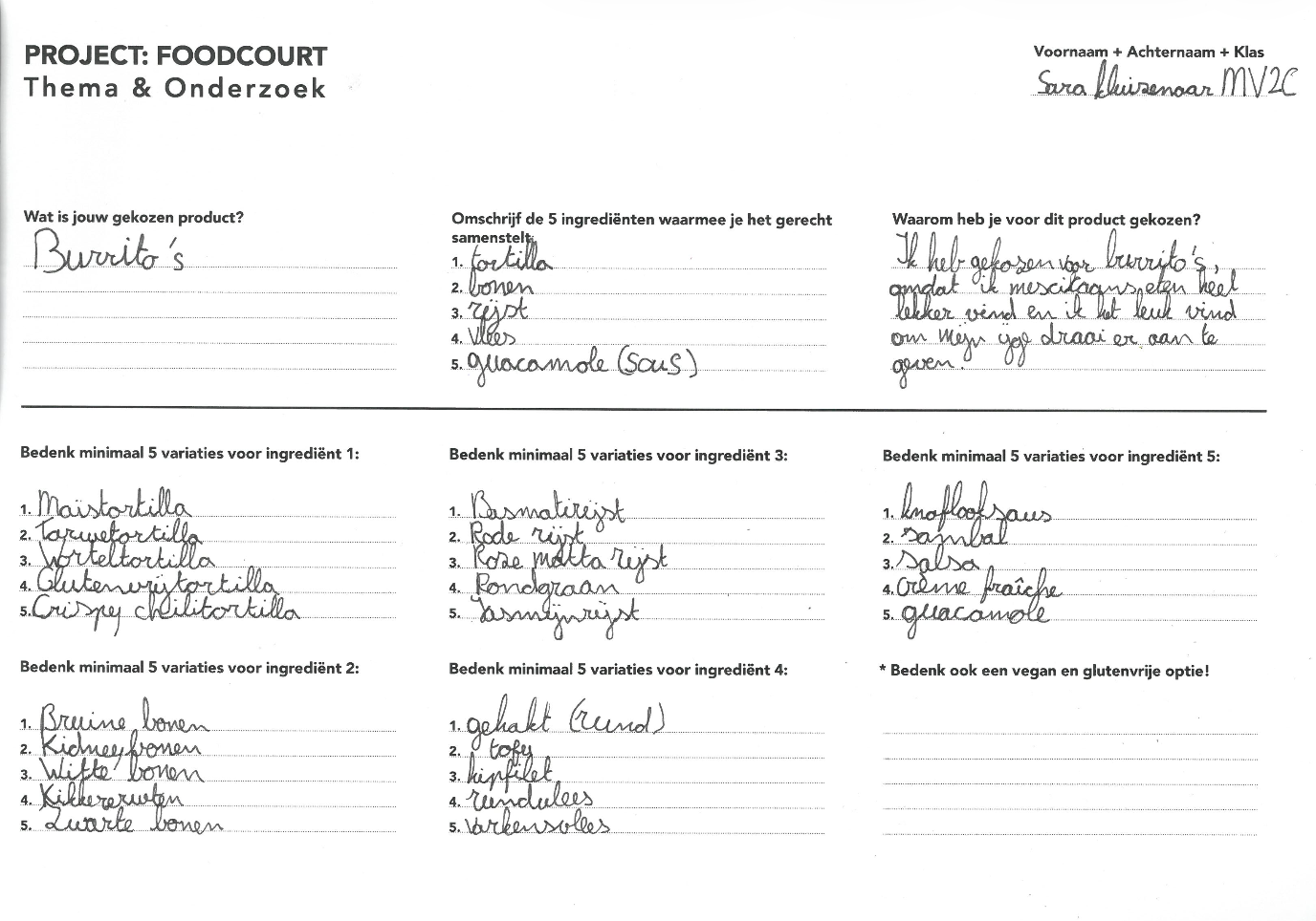 Ik heb eerst een gerecht gekozen (burrito’s) en toen de verschillende ingrediënten opgeschreven die ik wilden gaan gebruiken voor het gerecht daar van heb ik er uiteindelijk 10 uitgekozen. Later heb ik kleuren, lettertypen, lijnen, enz uit tijdschriften gehaal en daar drie verschillende kolages van gemaakt.